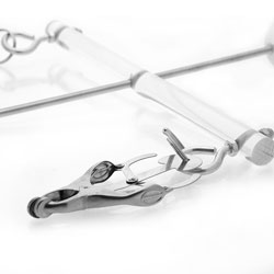 Category: Nipple Clamps Code: 665-1404 Take nipple play to the next level with The Tower of Pain. A simple yet very efficient design to help you squeeze and pull on your subs nipples. The Tower of Pain includes to two Japanese Clover Clamps at each end of clear rod. Once claps are attached to their nipples, place the rest plate ontop of there sternum and then screw in the ball rod and start stretching their nips! Simply turn the ball to pull the clear rod further away from their chest, making the clover clamps pull more. Keep them on the edge as they see you reach for the ball to turn it. Tower of Pain disassembles very easily for you to put away and put away or pack in your luggage. Color: Silver Brand: Kink Industries